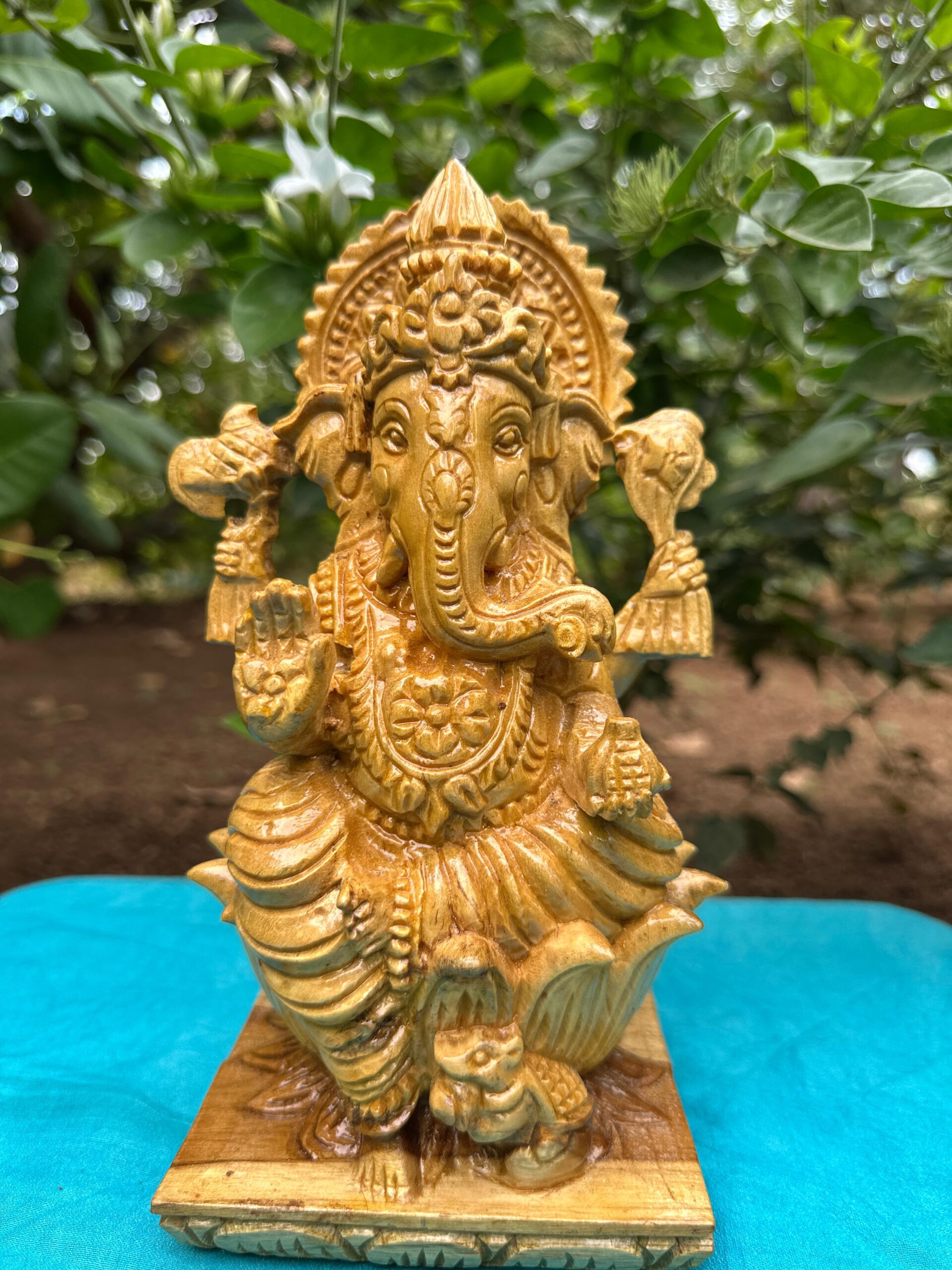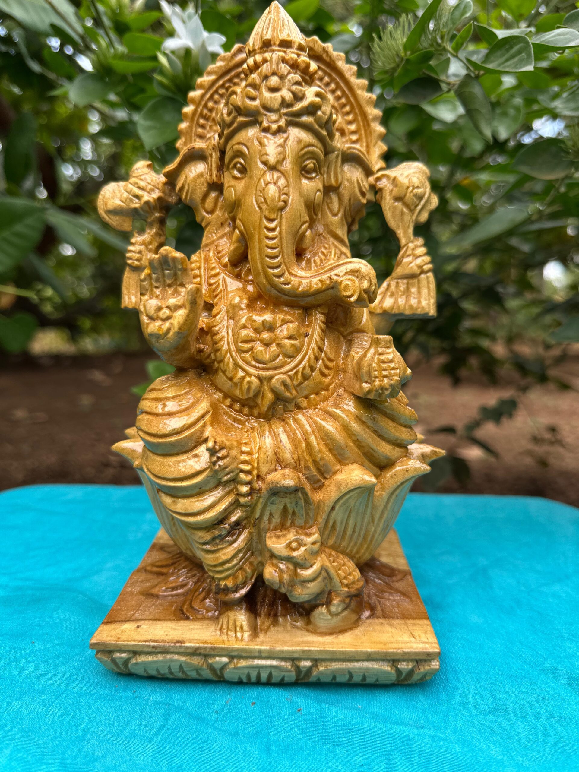 This multi-sided wooden statue, not a single-sided piece, is crafted from pure country teak wood using a four-axis CNC machine and features hand-finished details. In the image or video, mention the size and color of the item that will be delivered to your hands.